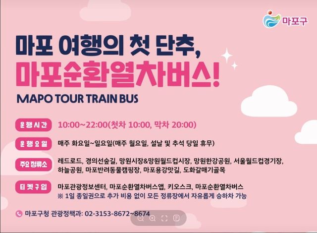 마포순환열차는 도시 속에서 새로운 경험을 제공하는 독특한 교통 수단 및 관광 자원이 될 것입니다. 마포의 다양한 매력을 즐기고 싶다면, 이 귀여운 열차를 타보세요. 탑승 정보는 마포구청 공식 홈페이지 또는 마포관광 사이트를 통해 확인할 수 있습니다.