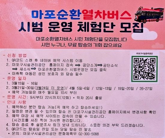 현재 시범 운행 중이며, 위 이미지의 QR 코드를 스캔해 네이버 예약 시스템을 통해 예약하실 수 있습니다. - 자세한 정보는 마포구시설관리공단 홈페이지에서 확인 가능하며, 5월부터 유료 정식 운행이 시작될 예정입니다.