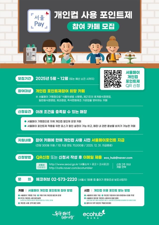 이 제도는 시민이 참여 매장 카페에서 개인컵을 이용해 음료를 구입할 경우, 매장 자체할 인(100원이상)에 더해 서울시가 서울페이 포인트 300원을 추가로 적립해 주는 방식이다.