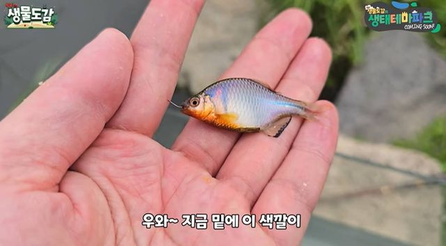 첫 번째로 낚인 어종은 각시붕어 수컷. 유튜버는 “색깔이 정말 예쁘다. 배면 색깔이 거의 고추장이다. 햇빛을 받으면 발색이 훨씬 진해진다”고 설명했다. 이어 “이게 바로 지금 시즌에만 관찰할 수 있는 납자루아과의 아름다운 혼인색”이라며 연신 감탄했다.