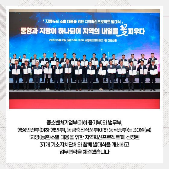 중소벤처기업부와 법무부, 행정안전부, 농림축산식품부는 30일 '지방(농촌)소멸 대응을 위한 지역혁신프로젝트'에 선정된 31개 기초자치단체와 함께 발대식을 개최하고 업무협약을 체결했다고 밝혔다.