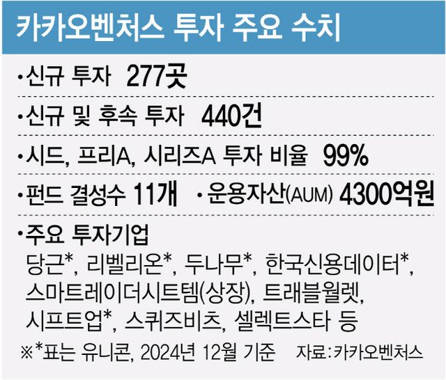 2일 업계에 따르면, 지난해 말 기준 카카오벤처스가 투자한 스타트업은 총 277개사에 달한다. 후속 투자 건까지 포함하면 440건을 넘어섰다. 지금까지 총 11개 펀드를 결성했으며, 운용자산(AUM)은 약 4300억원 규모다.