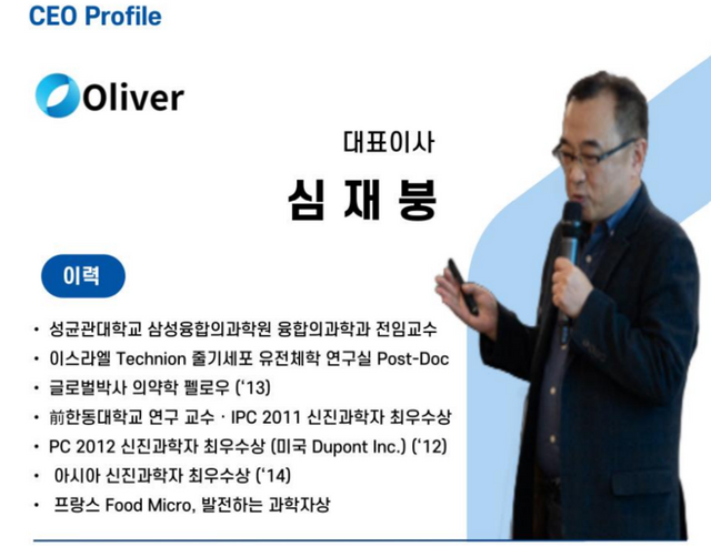 올리버생명과학은 IR 자료에서 올리버와 동일한 사업자번호와 대표이사의 이름을 기재했다. 다만 대표이사의 이력은 실제와 다르게 소개됐다. 심재붕 대표이사는 IR 자료에서 성균관대학교 삼성융합의과학원 융합의과학과 전임교원으로 나온다. 그러나 심 대표는 해당 학과와 의과학원은 물론, 성균관대에도 교원으로 등록되지 않았다.