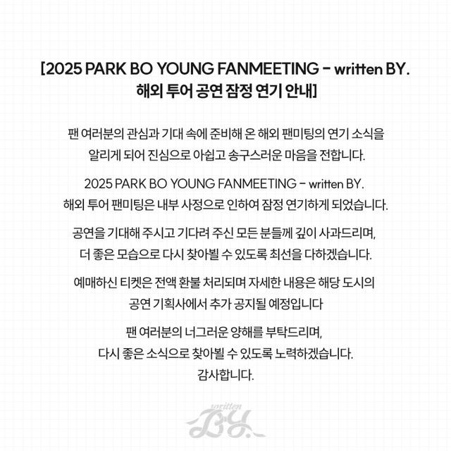 2025 PARK BO YOUNG FANMEETING - written BY. 해외 투어 팬미팅은 내부 사정으로 인하여 잠정 연기하게 되었습니다.