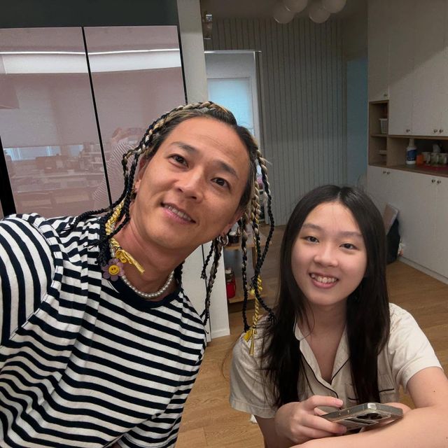 또한 함께 찍은 사진에서 팝핀현준은 독특한 땋은 헤어스타일과 스트라이프 티셔츠 차림으로 딸 옆에서 자랑스러운 미소를 짓고 있다.