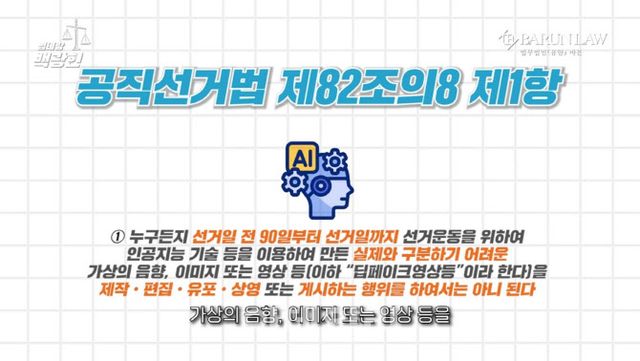 공직선거법 제82조의8 제1항은 “누구든지 선거일 전 90일부터 선거일까지 선거운동을 위해 인공지능 기술 등을 이용해 만든 실제와 구분하기 어려운 가상의 음향·이미지·영상 등을 제작·편집·유포·상영·게시하는 행위를 해서는 안 된다”고 명시하고 있다.