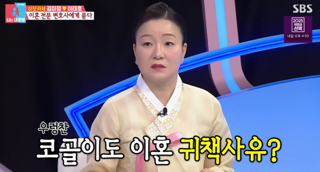 이날 김미령은 박민철 변호사에게 “남편이 코를 엄청 곤다. 코골이도 이혼 귀책 사유가 되냐”고 궁금해했다.