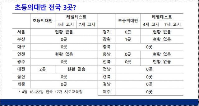 한편 교육부는 오는 7월말까지 전국 교육청과 영어유치원을 대상으로 한 레벨테스트 전수조사에 나서겠다고 밝혔다. 다만 해당 조사에서도 초등의대반 관련 내용은 빠져있다.