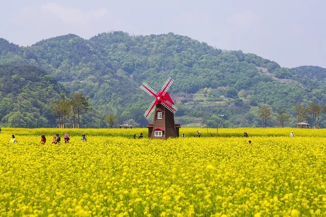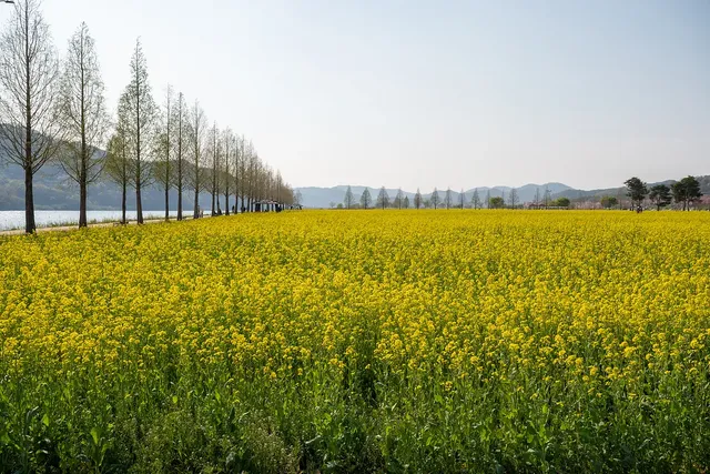축제가 끝난 이후에도 4월 중순까지 아름다운 유채꽃을 만끽할 수 있는 이곳은 사진 찍기에 이상적입니다. 넓은 꽃밭은 인생샷을 남기기에 완벽한 장소입니다. 들려오는 새소리와 함께 산책을 즐기며 몸과 마음을 치유할 수 있습니다.