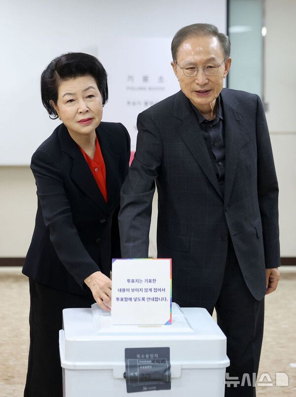 뉴시스 보도에 따르면, 이 전 대통령은 이날 오전 김 여사와 함께 서울 강남구 논현1동 제3투표소에서 투표했다.