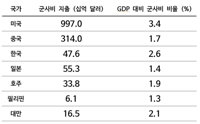 미국에 '노(No)'라고 말하면서 효과적으로 대처하기 위해서는 국방비부터 비교할 필요가 있다. 스톡홀름 국제평화연구소(SIPRI)에 따르면, 2024년 중국의 국방비는 3,140억 달러로 GDP 대비로는 1.7%였다. 이에 반해 미국과 미국의 아시아 동맹인 한국·일본·호주·대만·필리핀의 국방비 합계는 1조1,087억 달러로 중국의 약 3.74배에 달했다. 특히 아래 표에서도 알 수 있듯이 한국은 GDP 대비 2.6%로 다른 동맹에 비해 국방비를 많이 부담하고 있다.