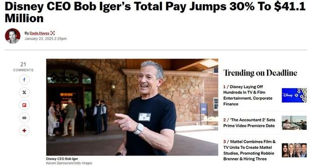 물론 디즈니 CEO인 밥 아이거의 총 연봉은 30% 오름