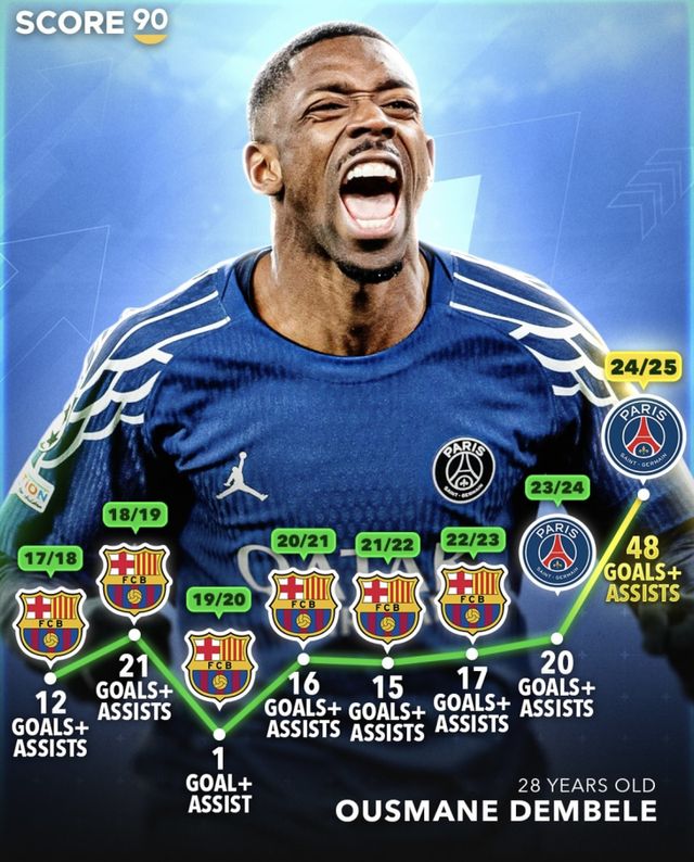 매체는 뎀벨레가 FC바르셀로나에서 뛰었던 2017~18시즌부터 공격포인트 개수로 그래프를 그렸다. 뎀벨레는 지난 시즌보다도 2배 이상 많은 공격포인트를 적립했고, 그래프는 오른쪽으로 급격히 치솟았다.