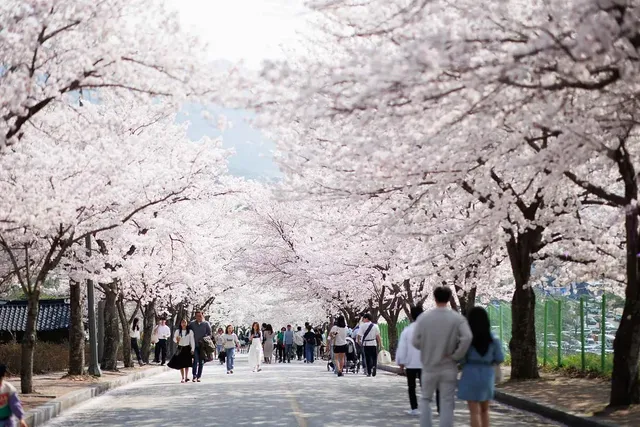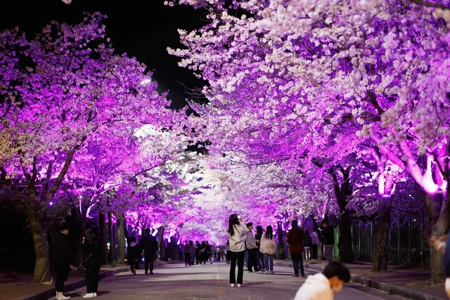 석정지구의 벚꽃 터널은 1km 길이로, 2km에 달하는 벚꽃길은 아름다운 산책로를 제공합니다. 낮에는 꽃길을 걷고, 밤에는 조명 아래 신비로운 벚꽃을 즐길 수 있습니다.