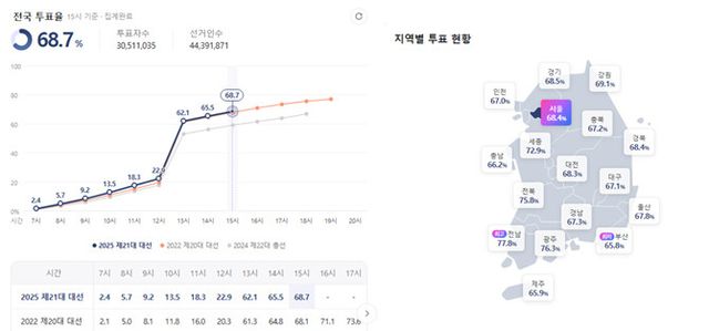 시간대별로 살펴보면 △오전 7시 2.4% △오전 8시 5.7% △오전 9시 9.2% △오전 10시 13.5% △오전 11시 18.3% △오후 12시 22.9% △오후 1시 62.1% △오후 2시 65.5% △오후 3시 68.7%를 기록했으며, 사전 투표는 1542만23607명이 투표했다.