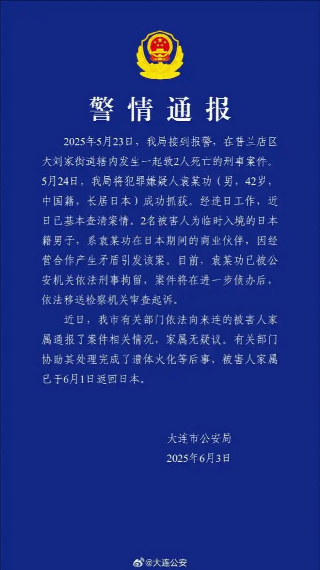 다롄 공안국은 “며칠 간의 조사 끝에 최근에 사건 (전말)이 거의 명확하게 드러났다. 피해자 2명은 일본에 일시적으로 (중국에) 입국한 남성들로, 위씨가 일본에 체류하는 동안 그의 사업 파트너였다. 이 사건은 사업 협력 과정에서 발생한 갈등으로 인해 발생했다”고 설명했다.