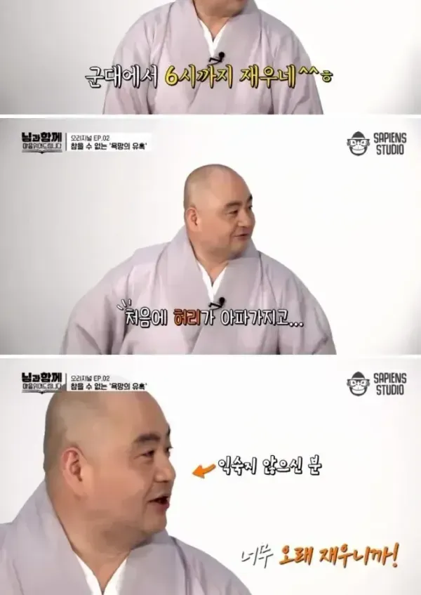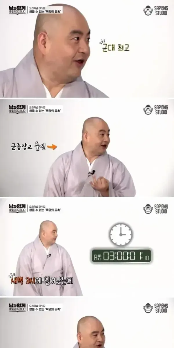 - 사찰에서는 새벽3시에 일어나는데 군대는 6시까지 잘 수 있음