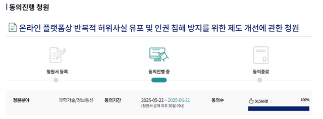 3일 오후 2시경 국회전자청원의 국민동의청원에 게재된 ‘온라인 플랫폼상 반복적 허위사실 유포 및 인권 침해 방지를 위한 제도 개선에 관한 청원’이 동의수 5만 명을 돌파했다.