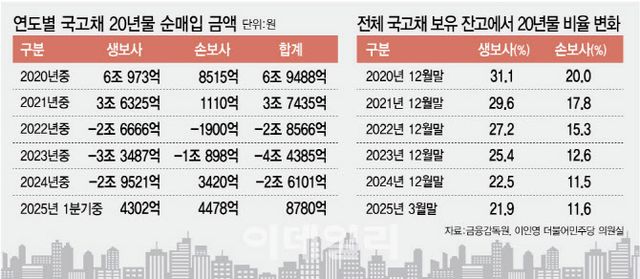이는 지난 2022~2024년까지 3년간 이어진 장기채 순매도 흐름과는 대조를 이룬다. 특히 생보사는 2023년 한 해에만 3조 3490억원을, 2024년에는 2조 9520억원을 순매도했다. 손보사도 2023년에는 1조원 이상을 팔았고, 2024년엔 매수로 전환했지만 규모는 3420억원에 불과했다.