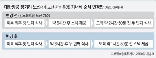 대한항공은 현재 장거리 노선에서는 ‘이륙 후 첫 번째 식사→간식→도착 전 두 번째 식사’ 순으로 기내식 서비스를 제공하고 있다. 이 때문에 일부 장거리 노선의 경우 첫 번째 식사와 두 번째 식사의 간격이 11시간 이상 벌어지거나, 현지시간 기준으로 새벽 시간대에 식사가 제공돼 신체 리듬에 맞지 않는다는 고객 피드백이 지속해서 접수돼 왔다.저야 뭐 그냥 쳐묵 쳐묵 스타일이라...딱히 생각 없었는데....저런 의견도 많았나보군요?