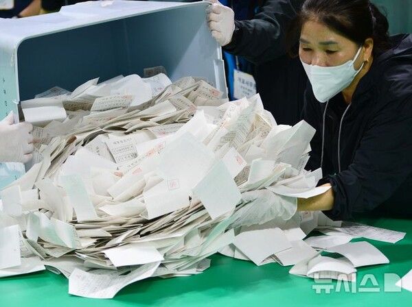 제21대 대통령선거 개표가 진행되고 있는 가운데 3일 오후 10시 현재 이재명 더불어민주당 대선후보와 김문수 국민의힘 대선후보가 각각 45.65%, 46.26%의 득표율을 기록 중이다.