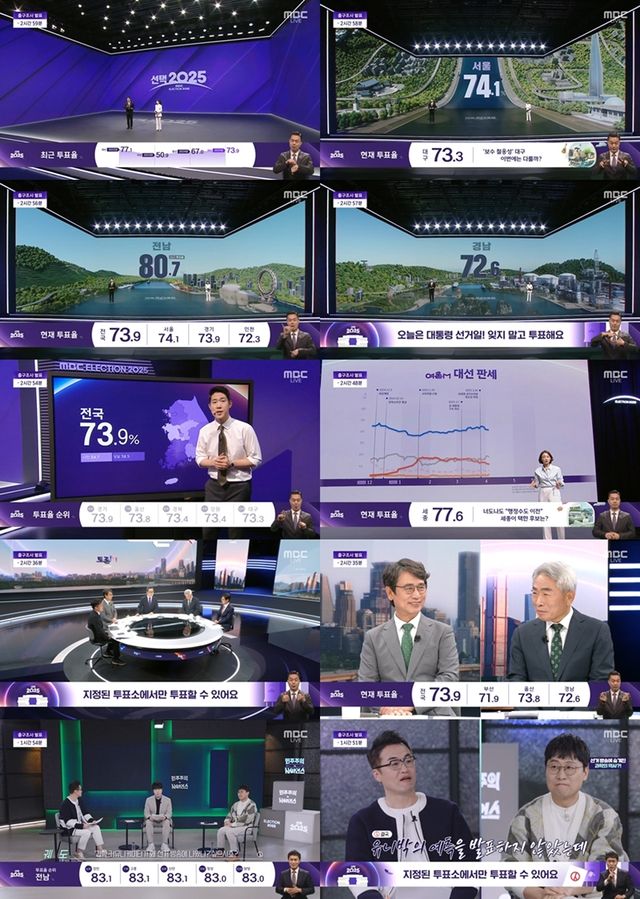 MBC 조현용 앵커와 이재은 아나운서의 진행으로 문을 연 MBC ‘선택 2025’는 기존 ‘4면 LED’ 무대를 ‘6면 LED’로 확장하고 ‘와이어캠’을 활용한 무대 연출로 역동적인 선거 방송을 예고했다. 특히 가로 도합 44미터, 높이 7미터의 메인 무대 LED 스크린을 한 폭의 화면처럼 활용해 17개 시·도를 상징하는 화면이 하나로 펼쳐지는 착시 그래픽은 시청자들에게 초현실적인 시각적 경험과 몰입감을 선사했다. 또 MBC ‘선택 2025’는 ‘터치M’, ‘데이터M’을 통해 현 시각 투표율 및 각 후보들의 지지율 변화 추이 등 각종 선거 관련 데이터를 쉽게 이해할 수 있도록 시각화해 시청자에게 전달했다.
