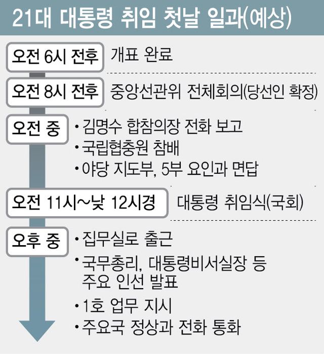 중앙선거관리위원회(선관위) 등에 따르면 4일 오전 7시에서 9시 사이 선관위는 전체 위원회의를 소집해 대통령 당선인 결정안을 의결할 예정이다. 선관위가 대통령 당선을 공식적으로 확정하면 당선인은 즉시 대통령 신분이 되고, 대통령 경호처에 의해 신변 보호를 받게 된다. 이번 대선은 대통령직 궐위에 따라 치러지는 조기 대선인 만큼 당선인 신분은 몇 시간에 불과하다.