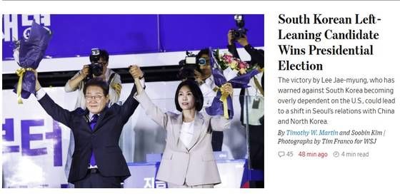 WSJ은 “소년공 출신인 이 후보는 한미동맹 강화, 일본과의 협력, 북한인권 문제 제기 등 전임 윤석열 정부의 외교정책 기조를 일부 계승하겠다고 공약했다”고 소개했다.