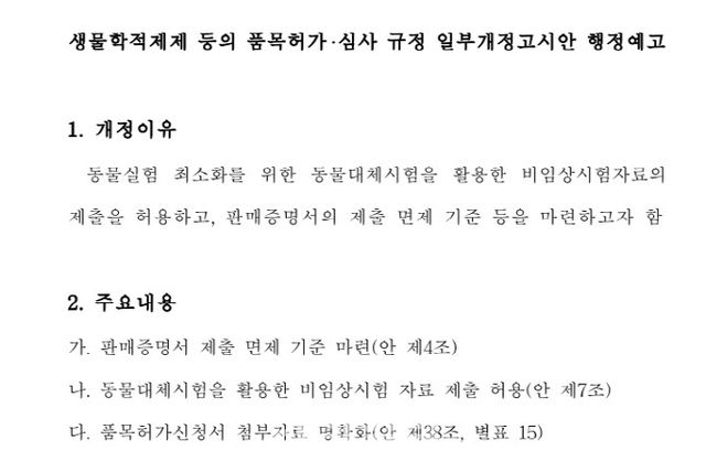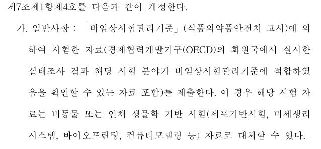 식품의약품안전처(식약처)도 FDA의 정책 변화에 발맞춰 동물실험을 줄이기 위한 제도 정비를 추진하고 있다. 식약처는 국제적으로 인정되는 시험법 등으로 실시한 비동물 또는 인체 생물학 기반 시험자료로 대체할 수 있다는 내용을 고시했다.