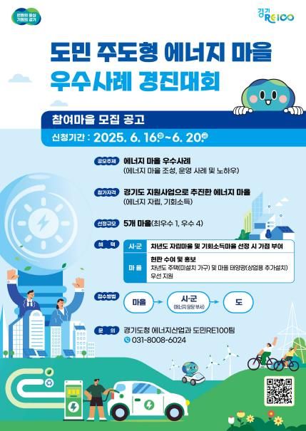 [파이낸셜경제=김영란 기자] 경기도는 오는 16일부터 20일까지 ‘도민 주도형 에너지 마을 우수사례 경진대회’에 참가할 마을을 모집한다. 이번 대회는 에너지 마을의 조성·운영과 주민 중심의 에너지 전환 활동 등에 우수한 성과를 낸 마을을 발굴하고, 이를 도내 다른 지역으로 확산시키기 위해 마련됐다.