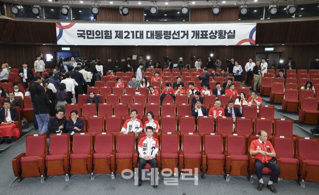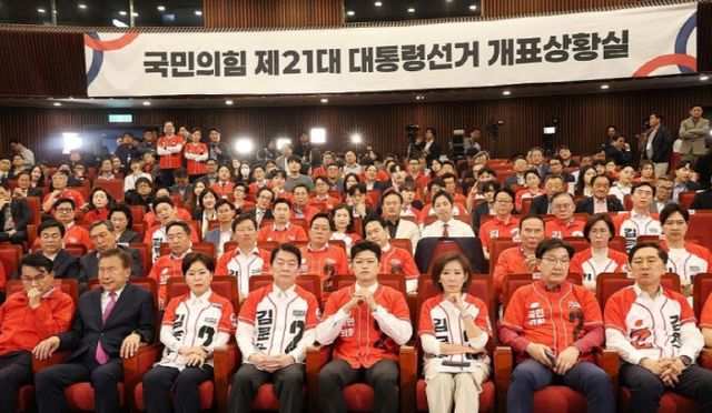국민의힘 지도부는 전날 국회도서관에 마련된 개표상황실에서 개표 방송을 함께 시청했다. 대선 직전까지 실시된 여론조사에서 두 후보 간 격차가 좁혀지고 있다고 본 국민의힘은 ‘골든 크로스’, ‘역전’을 기대했지만, 출구조사 결과가 나오자 상황실에는 무거운 침묵만 감돌았다.