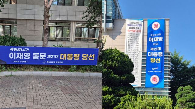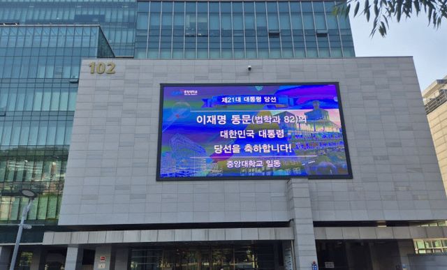 이 대통령 임기 첫날인 4일 오전 서울 동작구 중앙대 서울캠퍼스에는 ‘중앙의 아들 이재명 학우 제21대 대통령 당선 경축’이라는 현수막이 걸렸다. 중앙대 102관에 설치된 대형 스크린에도 ‘이재명 동문(법학과 82)의 대한민국 대통령 당선을 축하합니다!’라는 문구와 함께 이 대통령의 당선을 축하했다.