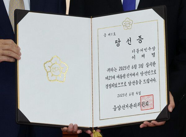 박찬대 더불어민주당 원내대표는 이 대통령의 대리인 자격으로 4일 오전 7시 11분 당선증을 대리 수령했다.