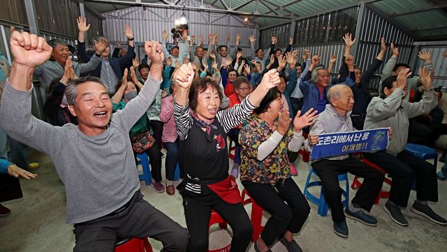제21대 대통령 선거일인 지난 3일 오후 이재명 더불어민주당 대통령 후보의 고향인 경북 안동시 예안면 도촌리 경로당에 모여 있던 주민들이 투표 종료 후 출구조사 결과를 지켜보다 이재명 후보가 앞선다는 소식에 환호성을 터뜨리고 있다. / 뉴스1
