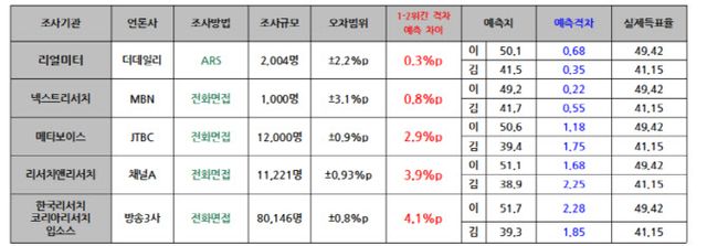 이어 MBN·넥스트리서치로 이 후보 49.2%, 김 후보 41.7%로 예측하면서 후보 간 격차가 7.5%p로 나타났다. 실제 득표율 격차와 0.8%p 차이다.