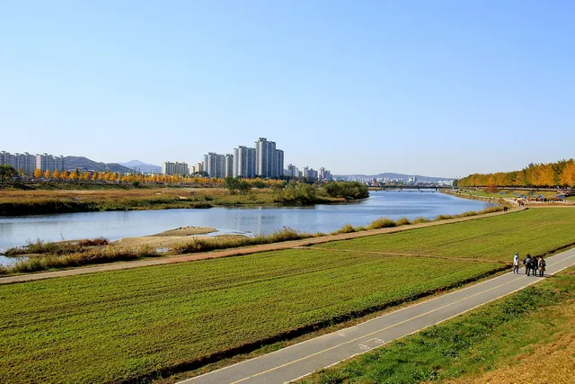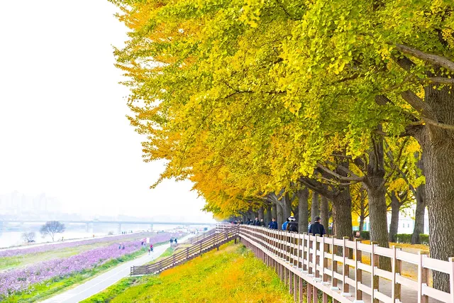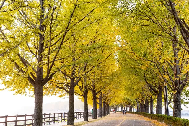 충남 아산의 곡교천 은행나무길은 오랫동안 가을의 황금빛 경관을 대표하는 명소로 유명합니다. 노랗게 변한 은행잎이 길을 덮어 그림 같은 낭만적인 풍경을 제공합니다.