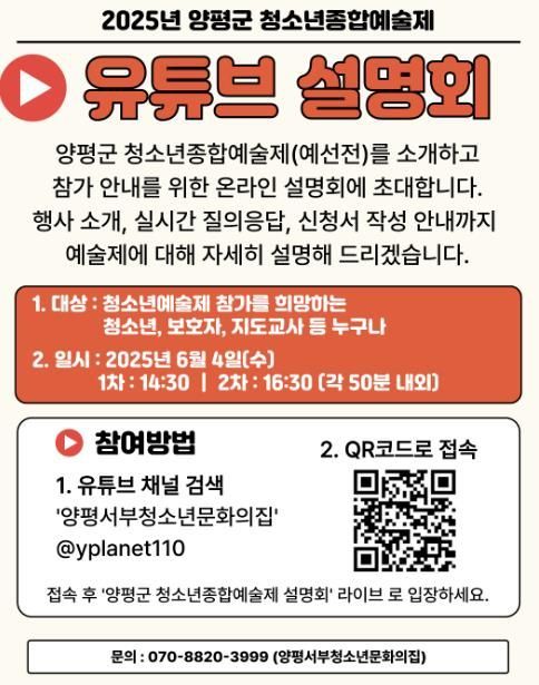 권역별 설명회에 참석하지 못한 분들을 위해 오는 6월 4일 오후 2시 30분과 4시 30분, 두 차례에 걸쳐 비대면 설명회가 추가로 진행될 예정이다. 해당 설명회는 양평서부청소년문화의집 유튜브 채널을 통해 실시간 방송으로 진행되며, 참가자들과의 실시간 소통도 가능하다.