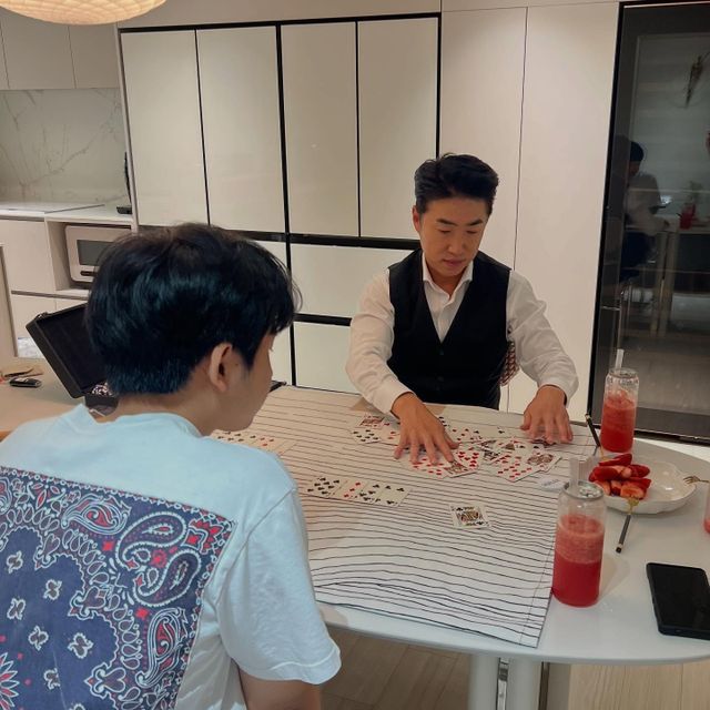 공개된 사진 속에서 장동민은 정장을 차려입고 진지한 표정으로 민하 군에게 카드를 가르치고 있다. 삼촌의 강의에 집중하는 민하 군의 뒷모습이 눈길을 끈다.