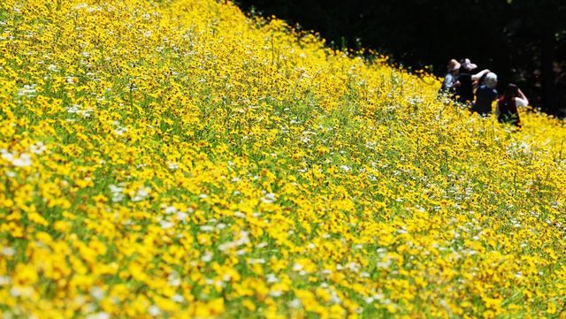 경기도 수원시 광교저수지를 찾은 시민들이 금계국을 감상하고 있다. / 연합뉴스
