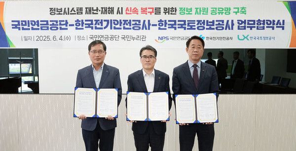 한국전기안전공사는 4일 국민연금공단·한국국토정보공사와 정보시스템 재난·재해 시 긴급 지원 확보를 위한 자원 공유망 구축 업무협약을 체결했다고 밝혔다.