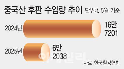 4일 한국철강협회에 따르면 지난달 중국산 후판 수입량은 6만2038톤(t)으로, 지난해 같은 기간(16만7201t)보다 약 63% 줄었다. 이러한 급감은 지난 4월 24일부터 중국산 후판에 27.91%에서 최대 38.02%까지 반덤핑 관세가 부과된 영향으로 풀이된다.