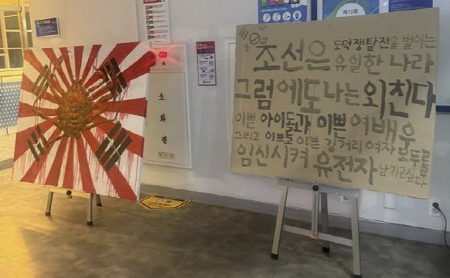 4일 대학가에 따르면 서울 성북구 한성대 건물 내에 전날 오후 11시 10분께 일본 제국주의를 상징하는 욱일기와 태극기를 섞어 놓은 듯한 그림이 전시됐다. 또 다른 전시물에는 ‘조센징’, ‘역겨운 조센징들은 부끄러움을 모른다’ 등 혐오 발언이 적혀 있다.