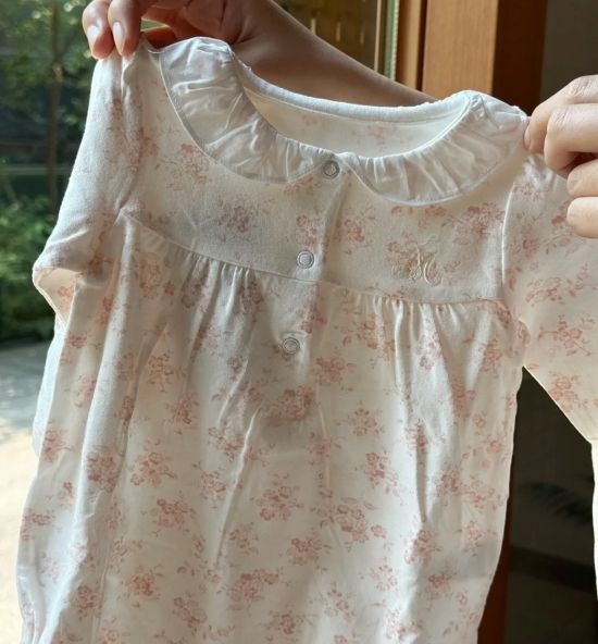 또 다른 사진은 지인으로부터 선물을 받은 여자 아이 옷. 분홍색 꽃 무늬 패턴이 새겨진 디자인이 귀엽고 사랑스럽다.