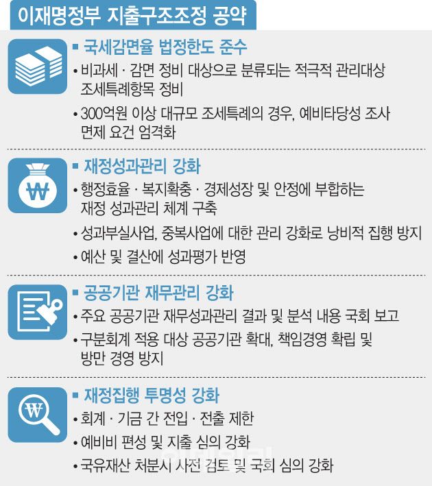 이재명 정부는 공약 이행을 위해 지출 구조조정에 나설 방침이다. 앞서 발표한 공약집을 보면 △국세감면율 법정한도 준수 △재정 성과관리(부실·중복사업 관리 강화 등) 강화 △공공기관 재무관리 강화 △예비비 편성 및 지출 심의 강화 등으로 재원을 확보한단 구상이다.