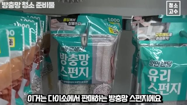 영상에서 소개된 방충망 청소 아이템은 다이소에서 판매하고 있는 '방충망 스펀지' 상품이다. 정확한 상품명은 '극세사 폴딩 청소 스펀지'이며 품번은 '1050256'이다. 가격은 단돈 천 원이다.