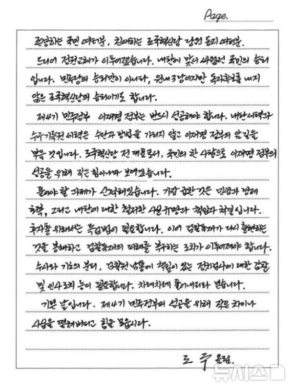 조 전 대표는 옥중서신에서 "드디어 정권교체가 이뤄졌다"며 "내란에 맞서 싸웠던 국민의 승리다. 민주당의 승리만이 아니라 원내 3당이지만 독자후보를 내지 않은 조국혁신당의 승리이기도 하다"고 밝혔다.
