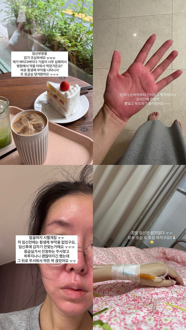 그는 이어 "갑자기 손바닥부터 간지럽고 빨개지더니 순식간에 온몸이 빨갛고 두드리거 올라왔어요"라며 "얼굴까지 시뻘개졌다. 저 임신 전에는 항생제 부작용 없었고, 임신 후에 갑자기 안 맞는다. 응급실 가서 진정하는 주사 맞고 하루 지나니 괜찮아지긴 했는데 그 뒤로 무서워서 약은 싹 끊었어요"라고 말했다.