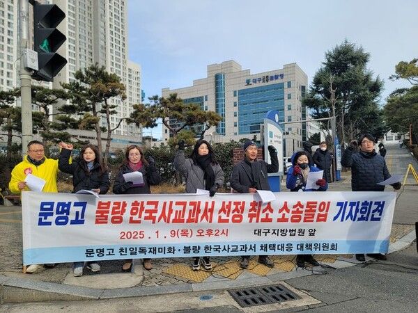 앞서 지난해 10월 경북 경산시 문명고등학교는 유일하게 한국사 교과서 9종 중 한국학력평가원이 펴낸 보수 성향의 교과서를 채택했다. 이에 일부 진보 정당·단체들이 학교 앞에서 채택 중단을 요구하며 반발해 왔다. 친일·독재를 미화하고 있다는 주장에서다.