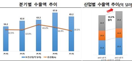 한국보건산업진흥원(원장 차순도)이 4일 발표한 2025년 1분기 보건산업 수출 실적에 따르면, 의약품과 화장품 수출 증가에 힘입어 전년 동기 대비 10.2% 증가한 65.2억 달러을 기록했다고 발표했다.