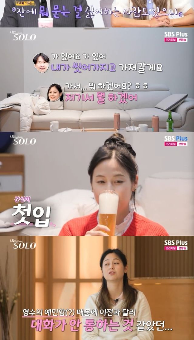 옥순은 맥주잔이 더럽다고 말했고 컵을 씻으러 간 영수에게 "수세미 있냐. 립스틱 다 묻어있다. 없으면 손으로 빡빡. 거기 말고 입술 닿는데다"라며 잔소리했다.